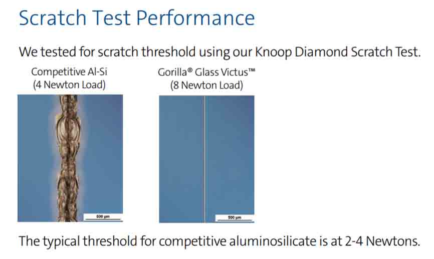 The latest Gorilla Glass Victus can survive a fall of up to 2m. That’s more than double the drop that normal glass can survive. According to Corning, non-Corning aluminosilicate glasses can’t survive drop beyond 0.8m. Similarly, Gorilla Glass Victus is more resistant than ever. In the Knoop Diamond Scratch Test conducted within the company, the new glass technology survived 8 Newton load with minor scratches.